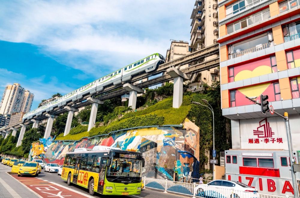 ▲ 该站位于重庆市渝中区嘉陵江畔的李子坝正街39号,是中国国内第一座与商住楼共建共存的跨座式单轨高架车站 。其独特之处在于,列车直接从一栋居民楼的6至8层穿过,将交通功能与建筑完美融合。
