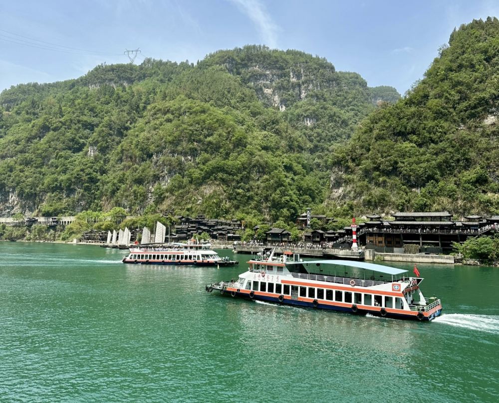 ▲ 碧绿的江面上,两艘橙白相间的游船正驶向岸边的三峡人家。仿古的乌篷船与白帆错落停靠在木质码头,吊脚楼依山而建,黛瓦飞檐隐在浓绿的山林间,仿佛把一段巴楚旧时光