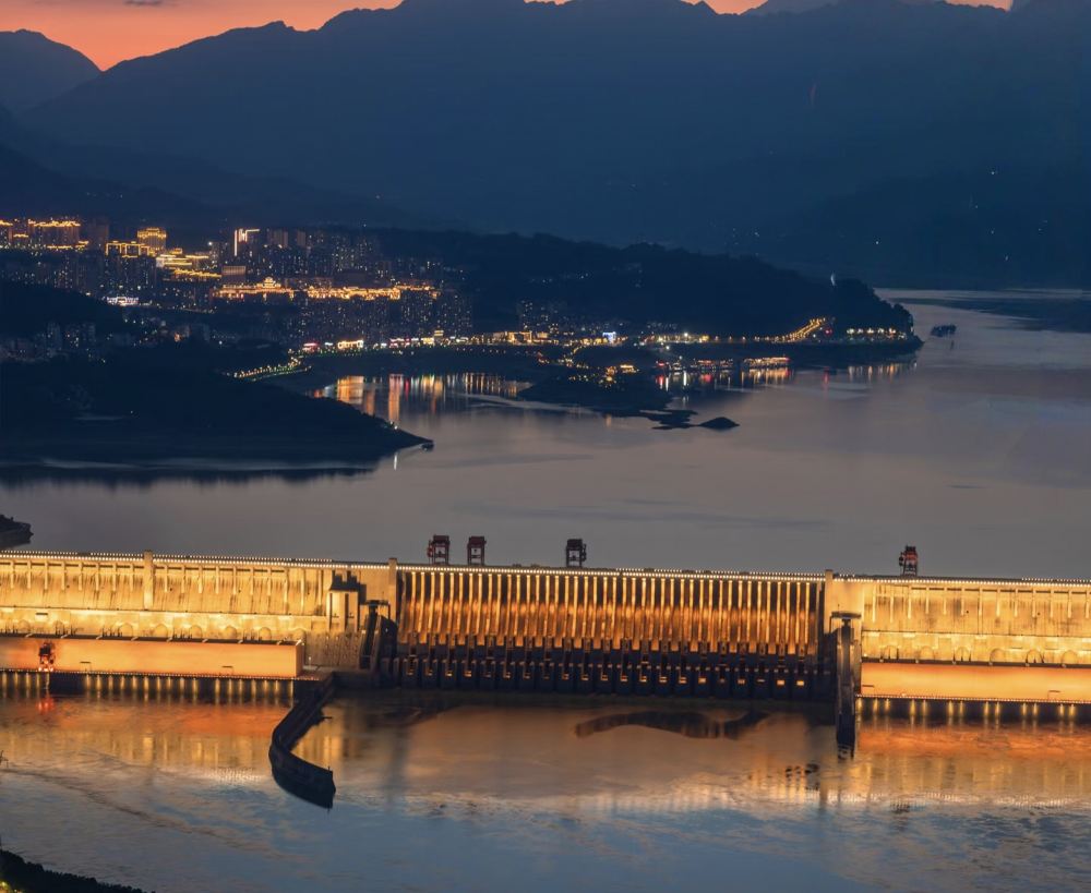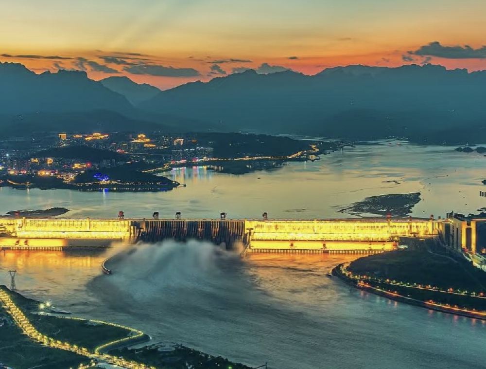 ▲ 暮色为三峡大坝披上了鎏金外衣,泄洪口翻涌的水雾在暖黄灯光下氤氲成朦胧的纱。坝后的平湖如镜,倒映着沿岸城市的万家灯火,远处层叠的青山在夜色里晕染成深浅不一的墨蓝,构成一幅壮阔又温柔的夜景