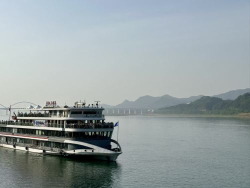 ▲ 薄雾轻笼的江面上,一艘银白相间的多层观光游轮正悠然前行。顶层甲板上站满了游客,凭栏眺望远处黛色的山峦与隐约的堤坝,江风裹挟着湿润的水汽,将三峡初夏的清爽送遍周身