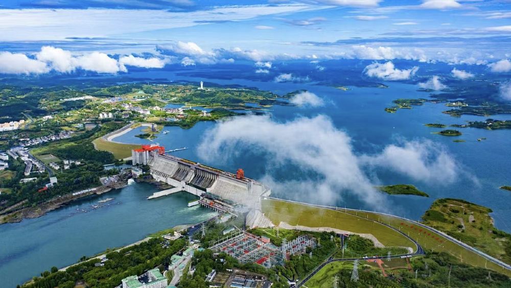 ▲ 晴日的高空视角下,三峡大坝如一座银色的巨人,稳稳扎根在长江之上。泄洪口腾起的水雾在阳光下凝成云朵,坝后的水库如巨大的碧玉,散落着星罗棋布的岛屿,与沿岸葱郁的田野、城镇共同织就出一幅高峡平湖的生态画卷
