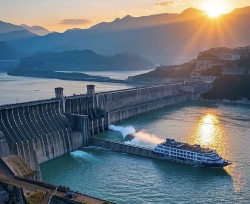 ▲ 清晨的阳光穿透云层,为三峡大坝的混凝土坝体镀上暖金色的光晕。泄洪口奔涌的江水激起漫天白雾,一艘蓝白相间的游轮正缓缓驶入船闸,在高峡平湖的壮阔背景里,渺小又坚定地完成着一次跨越