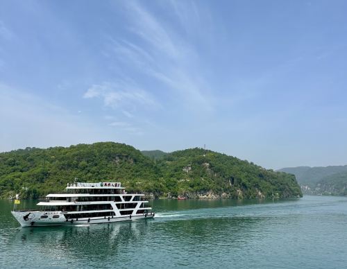 ▲ 船尾划出两道雪白的水痕。两岸青山如翠屏般展开,浓绿的植被覆盖着陡峭的岩壁,江面上的风带着草木清香,让这段西陵峡的航程成了一场流动的森林漫游