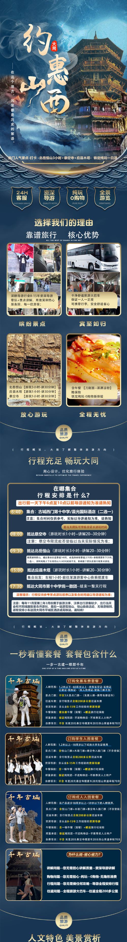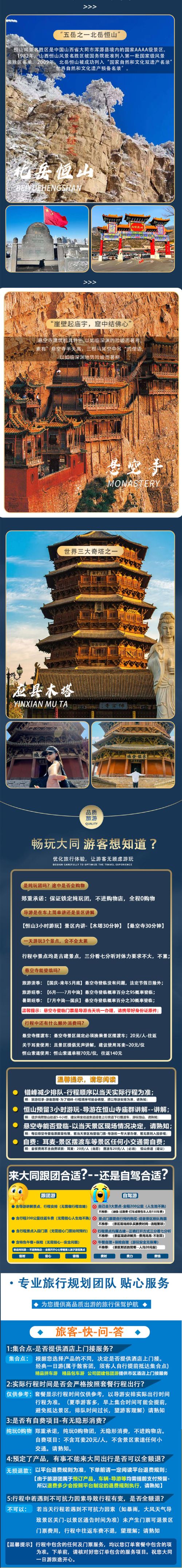 【温馨提示】:淡季出行游客较少,出行当天会和不同线路旅客合并游玩,我司会根据当天人数调整行程游览顺序,最后一站游览恒山,恒山自由活动,无导游陪同,返程安排