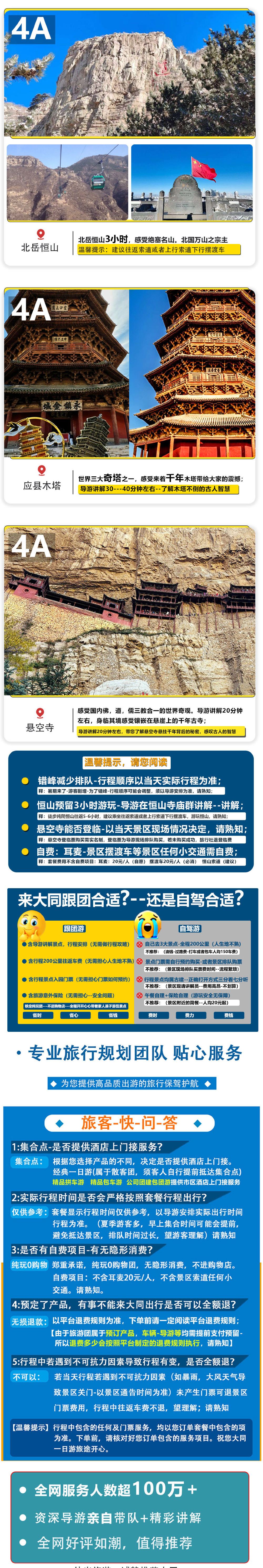 经典热门线路,悬空寺+北岳恒山+应县木塔,一车一导,全程资深导游带队+景点简绍讲解;