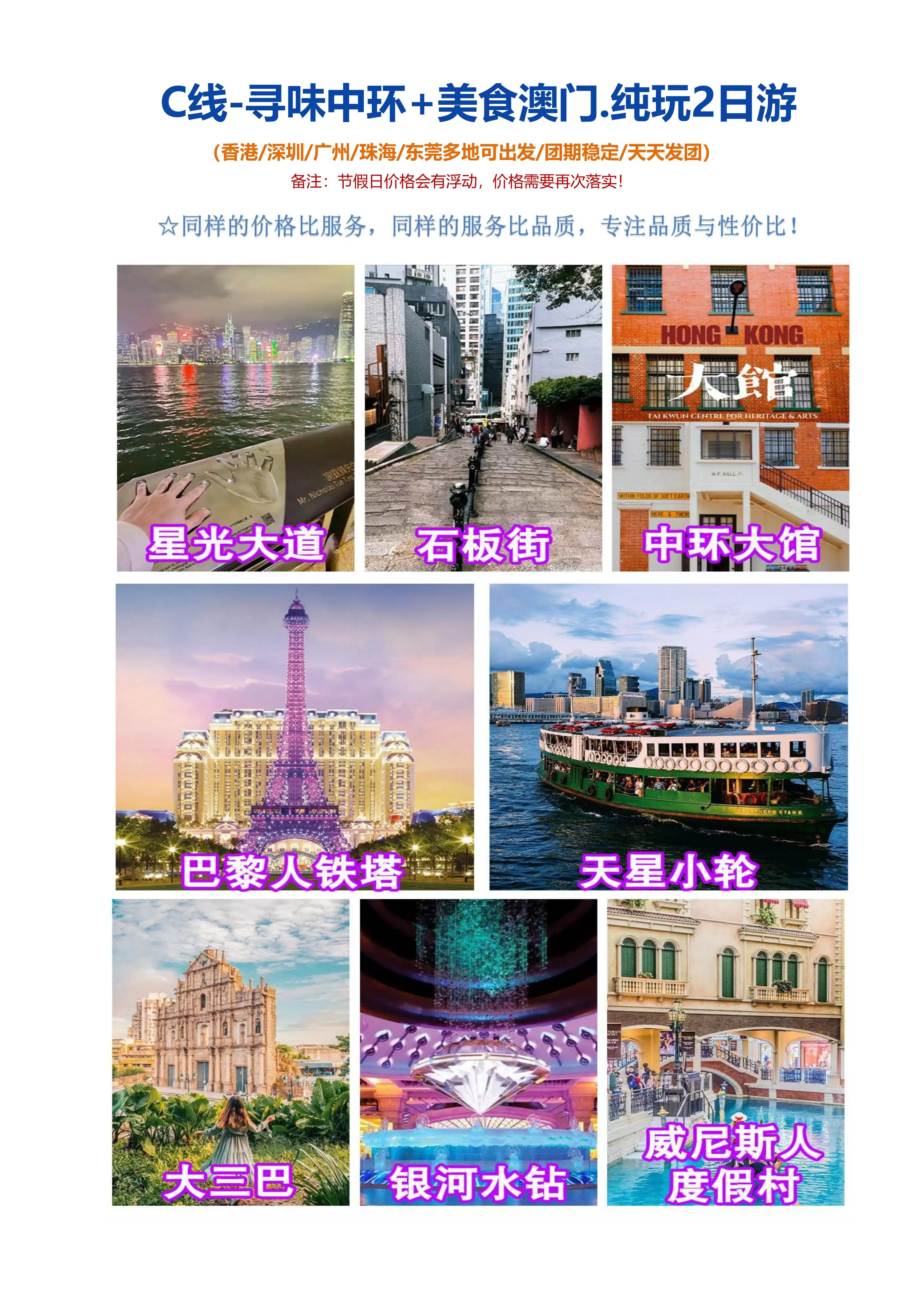 香港寻味中环+美食澳门纯玩2日丨住香港3钻/4钻酒店【送上网卡+保险+2正餐丨车观港珠澳大桥,广州出发】