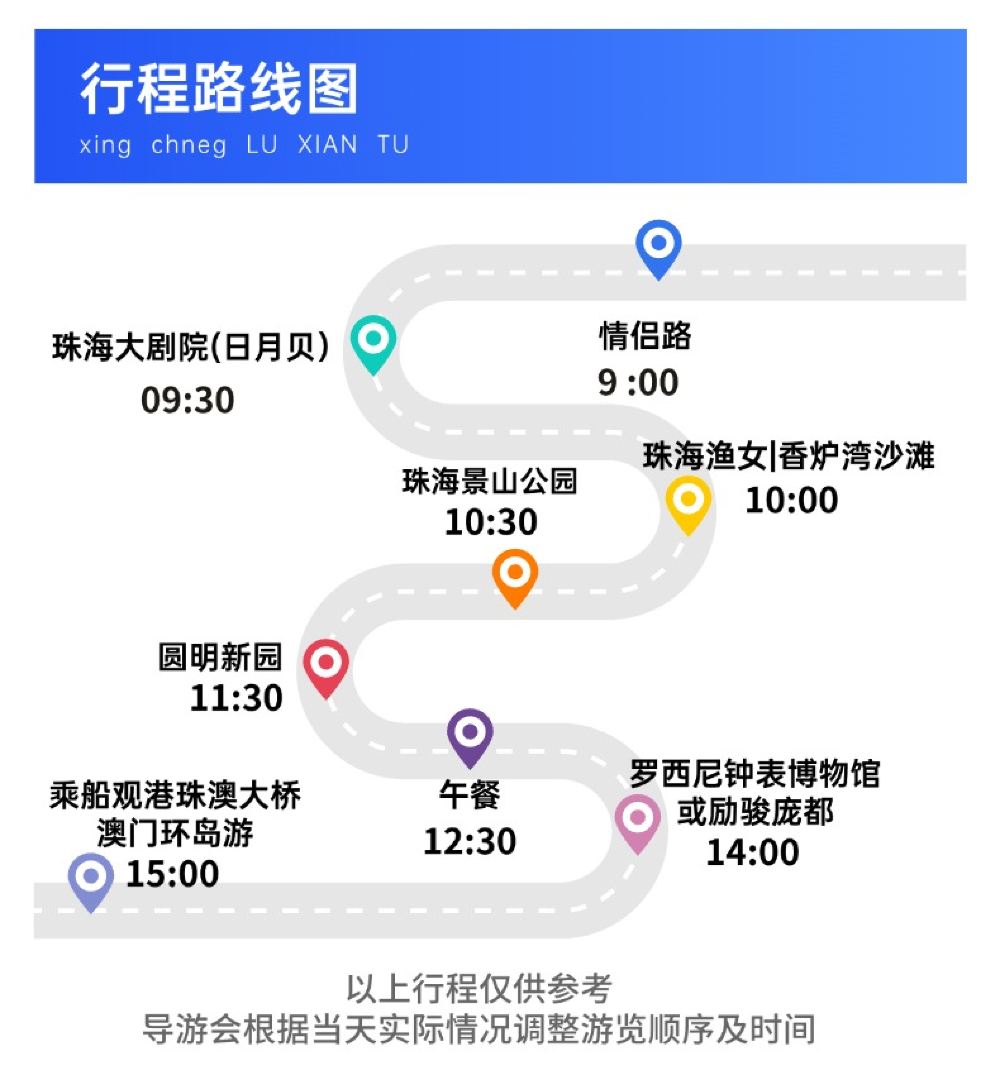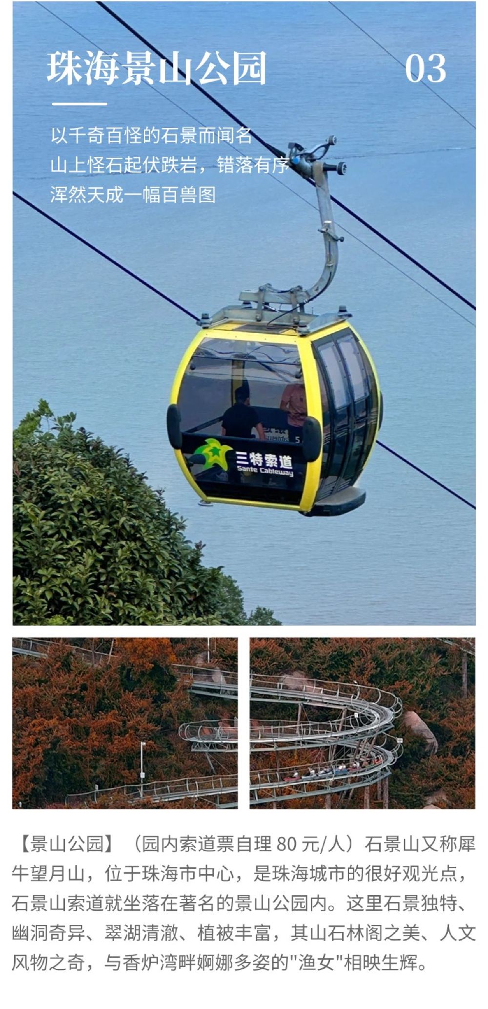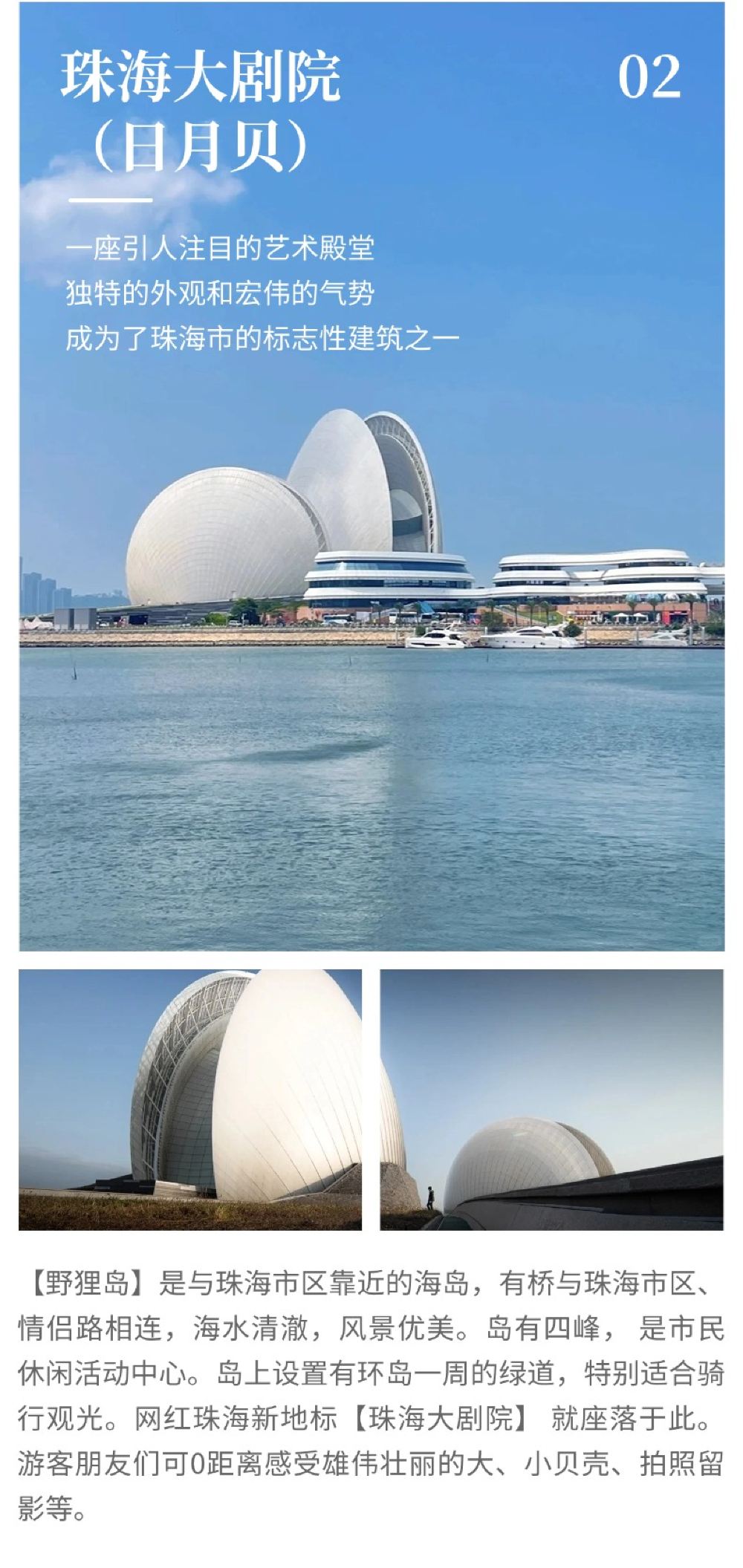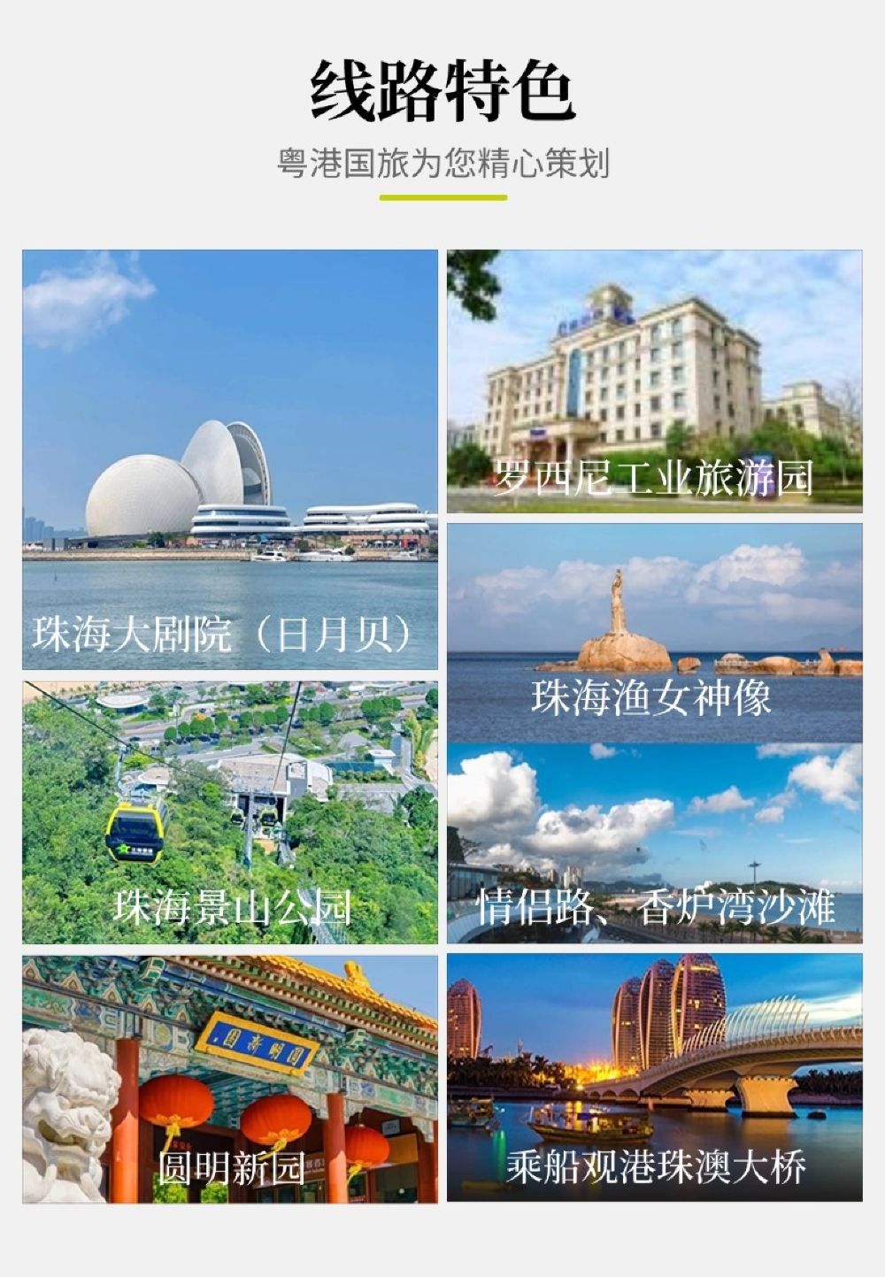 【景点门票】:情侣路、日月贝、珠海大剧院、香炉湾沙滩、渔女神像、香炉湾城市阳台、圆明新园、励骏庞都广场、港珠澳大桥游、(套餐1套餐2不含澳门环岛游)