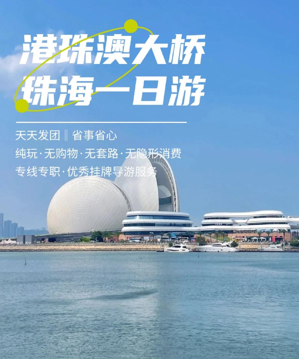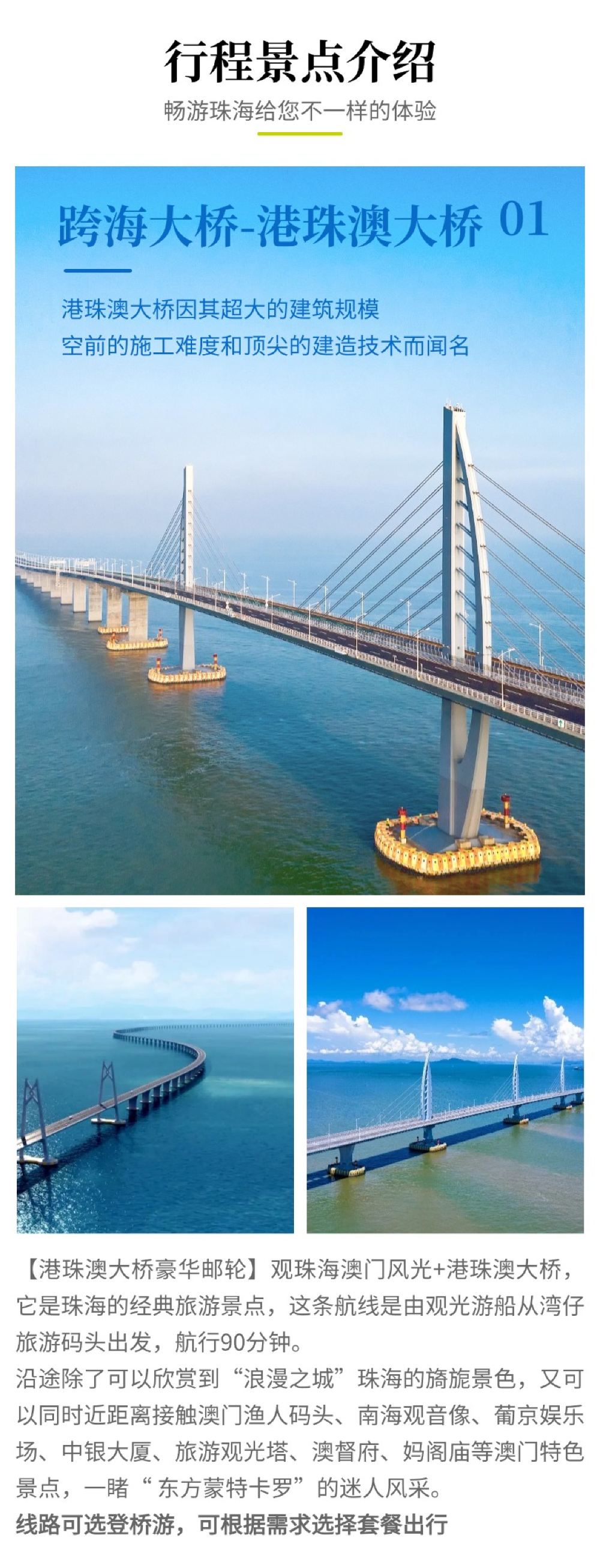 4.线路里面去到的珠澳人工岛是前往香港过关的口岸,并不是港珠澳大桥中间的人工岛,线路里面除了登桥游,都是安排乘船远观港珠澳大桥,望知悉!