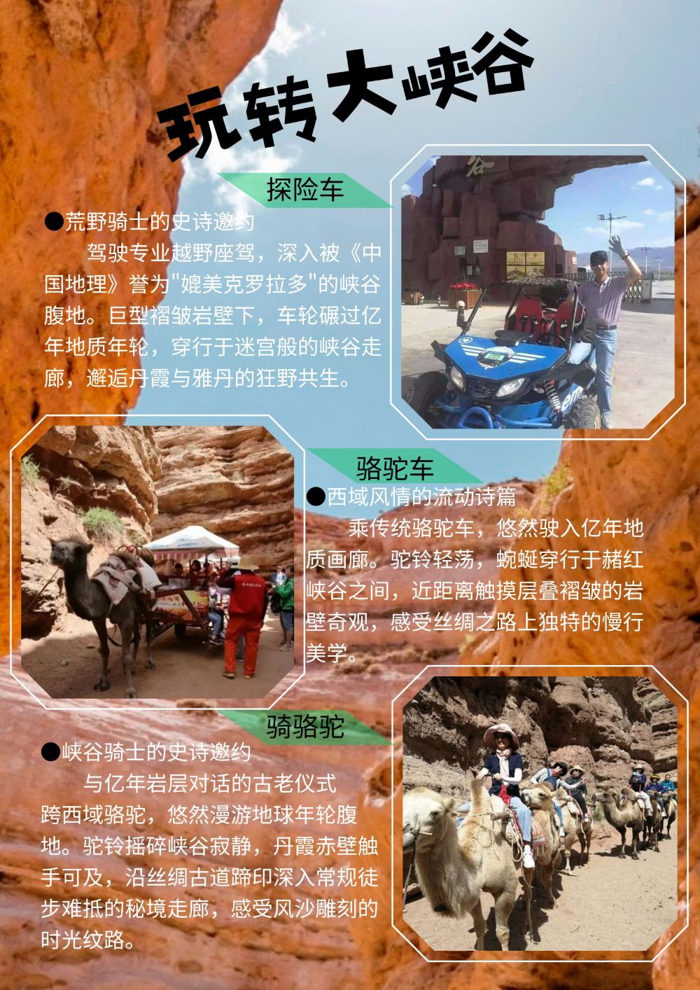 当九成游客在观景台打卡时,你正骑着骆驼深入血色峡谷腹地,指尖擦过风沙雕刻的岩壁;乘骆驼车摇进地壳运动的褶皱深处,越野车冲破常规路线藩篱——这是地质史诗的立体巡礼,浅游者永不可见的张掖另一面。