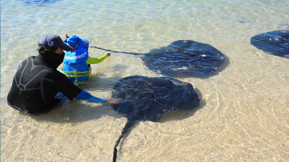 ▲ 分界洲岛的喂魔鬼鱼活动,学名鳐鱼,以微笑面容著称,游客可与其亲密互动,体验感受魔鬼鱼温和可爱的一面。