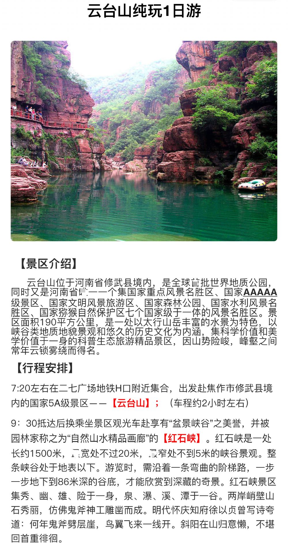 2.紫荆山百货大楼停车场集合点(始发站7:20集合),位于市中心是地铁1号2号线交汇处,乘坐地铁到达紫荆山站D口出来正前方就是集合地点。出租车或网约车司机对这里都很熟悉,可以提前一天预约也可当天随时打车时间都来得及不会耽误您的行程。