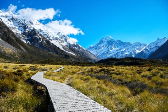 ▲ 抵达库克山村后,您可以选择前往塔斯曼冰川观景点步道,塔斯曼冰川观景点步道 - 这条步道穿过豪帕帕冰川的古老终碛,可欣赏到冰川、周围河流和塔斯曼湖的壮丽景色。