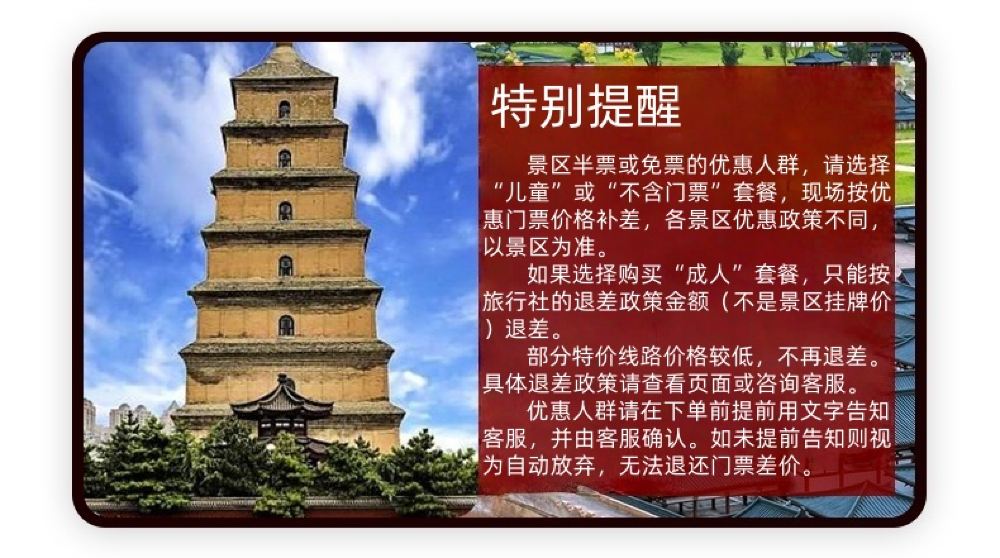 3、【退费政策】本产品半票人群不退费,免票人群退25元/人。是否免票人群,优免证件需景区认可,具体以景区核定为准。