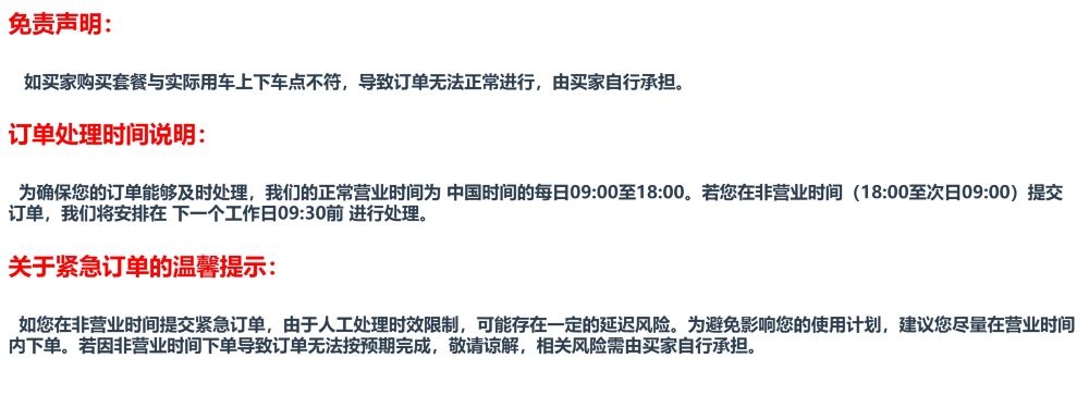 9、用车时间默认行程内标注的用车时间,客人如需变更用车时间请至少提前一天15:00前联系告知工作人员。