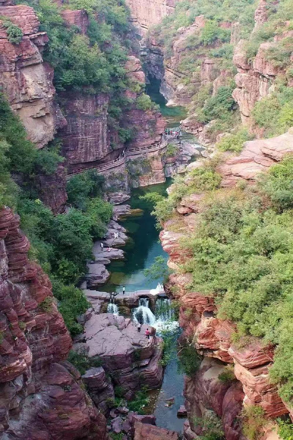 ▲ 邢台大峡谷既有北方山岳的雄伟气势,又具南方山水之秀美。奇峡群有三大景色:一是奇峡。谷底狭深、峡岸壁立、成群出现,构成了太行奇观;二是峻峰。周围山峰都是几近90度的红崖绝壁,峰峦叠嶂,上下错落,形成了高低变化,犬牙交错的天际线;三是飞瀑。黄巢岩下有一奇特而又壮观的瀑布,瀑布不是飞流直下,而由悬崖顶一深潭中翻腾而出,山泉奔流至此,钻入一石瓮,泉水在瓮中回旋而出,从数十米高的峭壁上飞溅而上。站在瀑布之下,水声、风声骤起,一股清风寒沁人入五脏,令人备感舒畅。峡谷群具有狭长、陡峻、深幽、赤红、集群五大特点