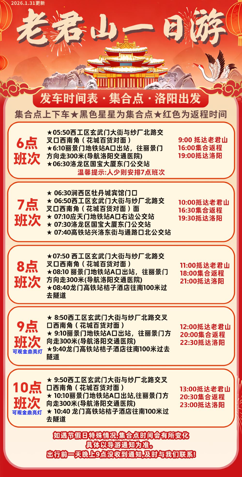 1:如遇春节,五一,十一,中秋等法定节假日或景区限流等情况,中班和晚班出发时间会提前一小时,具体以出行前一天导游通知为准