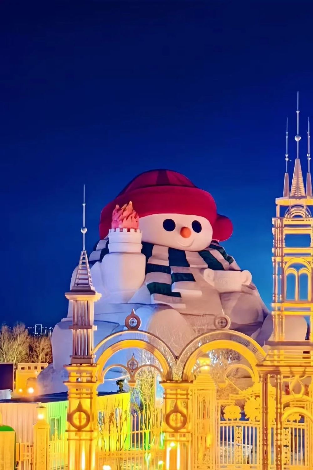 ▲ 巨型雪人巍然矗立,洁白的雪体在灯光照射下闪烁着柔和光泽,俏皮的围巾与帽子增添了几分可爱气息。背后的建筑与夜空形成鲜明对比,更突出雪人的视觉冲击力。站在现场可感受到冰雪的纯粹与冬季的童真,让人不由自主想靠近拍照。这个场景融合了哈尔滨冬季的特色与节日气息,是游客不容错过的标志性打卡点。