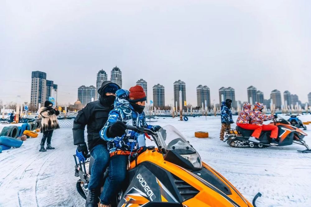 ▲ 雪地摩托停放在开阔的冰面上,鲜亮的车身颜色在白雪背景中十分醒目。游客在做好防寒保护后,即将体验冰雪项目带来的速度感与户外乐趣。远处的城市建筑与近处的冰雪活动同框,形成了冬季特有的对比与氛围,呈现出城市与自然并存的场景感。