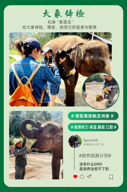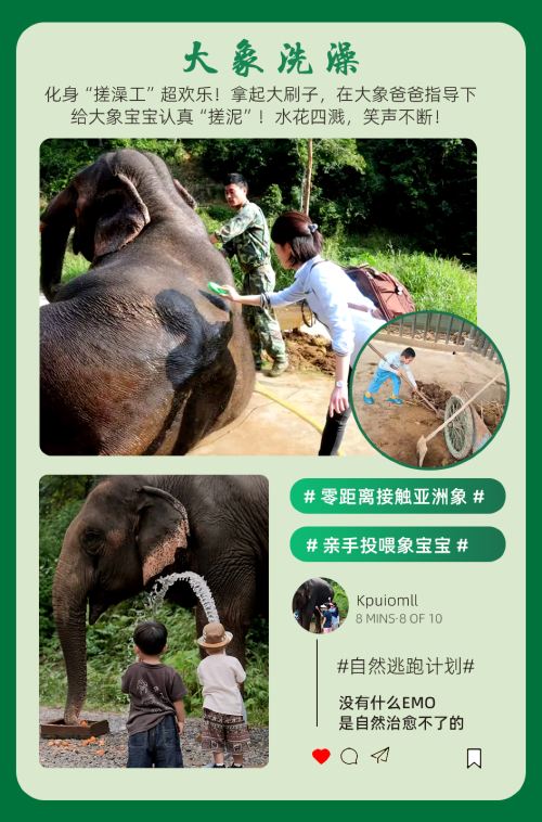 在象爸爸的带领下,体验象爸爸照顾大象的日常生活,在开展活动的过程中,可以喂它们喜爱的食物,帮助大象洗澡,最后,化身大象“铲屎官”,拿起扫帚为它们打扫象舍,收拾出一个干净整洁的家园,为这趟旅途留下一份珍贵的回忆。