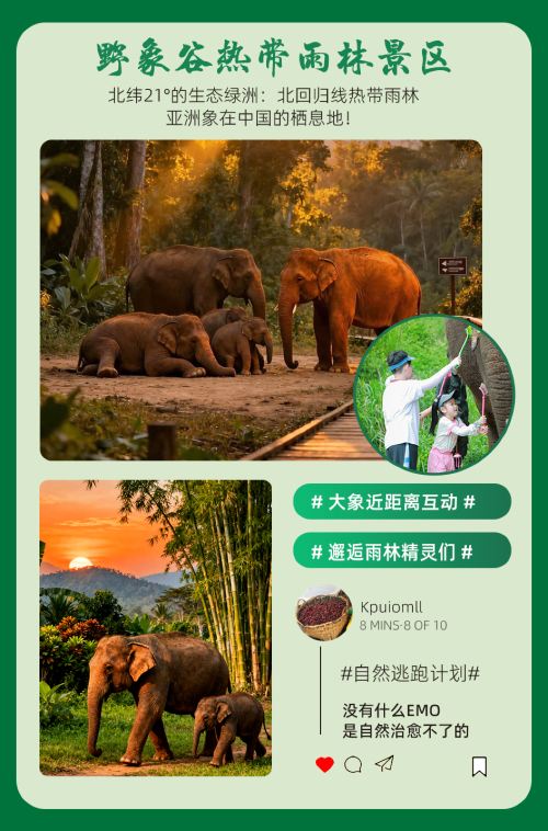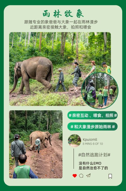 雨林牧象】:在热带雨林中跟随大象(1头)一起散步、亲密接触、拍照、喂食(含在票价里)!,目前20人以内一组每场,每场牧象50分钟左右,先跟着象(1头象)走一段(400米左右),到喂象点排队喂象、拍照。之后人、象分开由导游带着走路出来(800米左右),途中可以看到小动物。(全程与大象接触时间20分钟左右 )