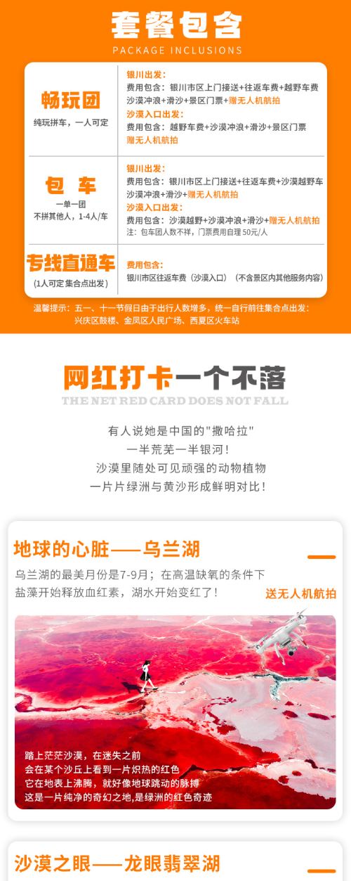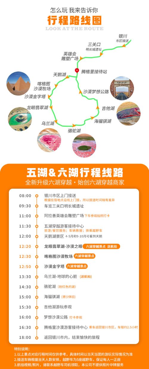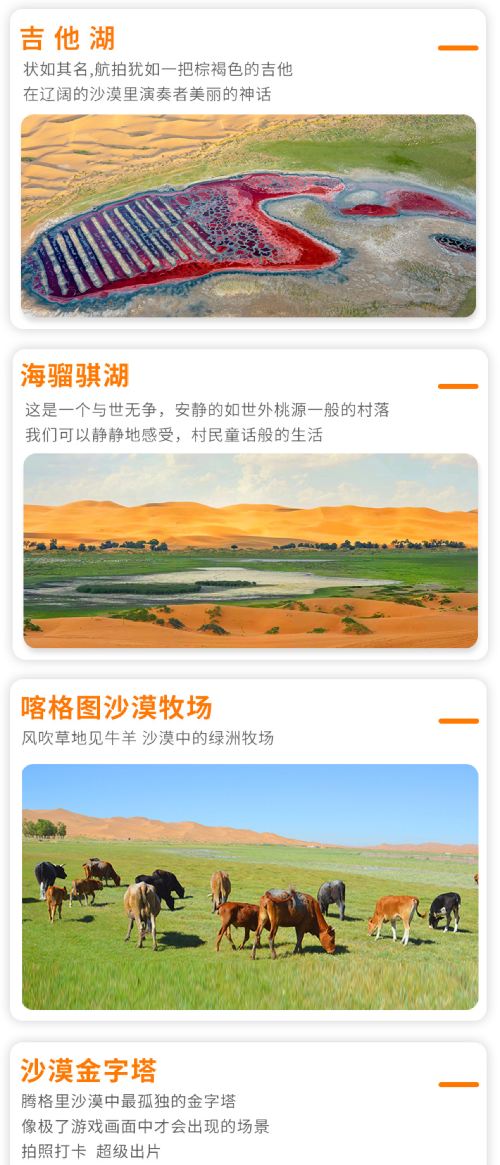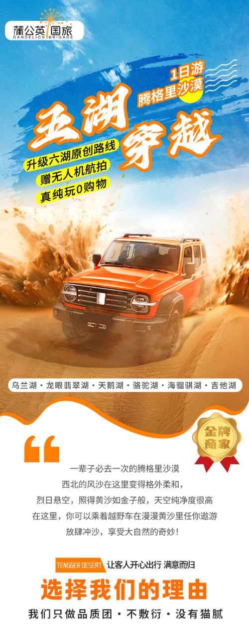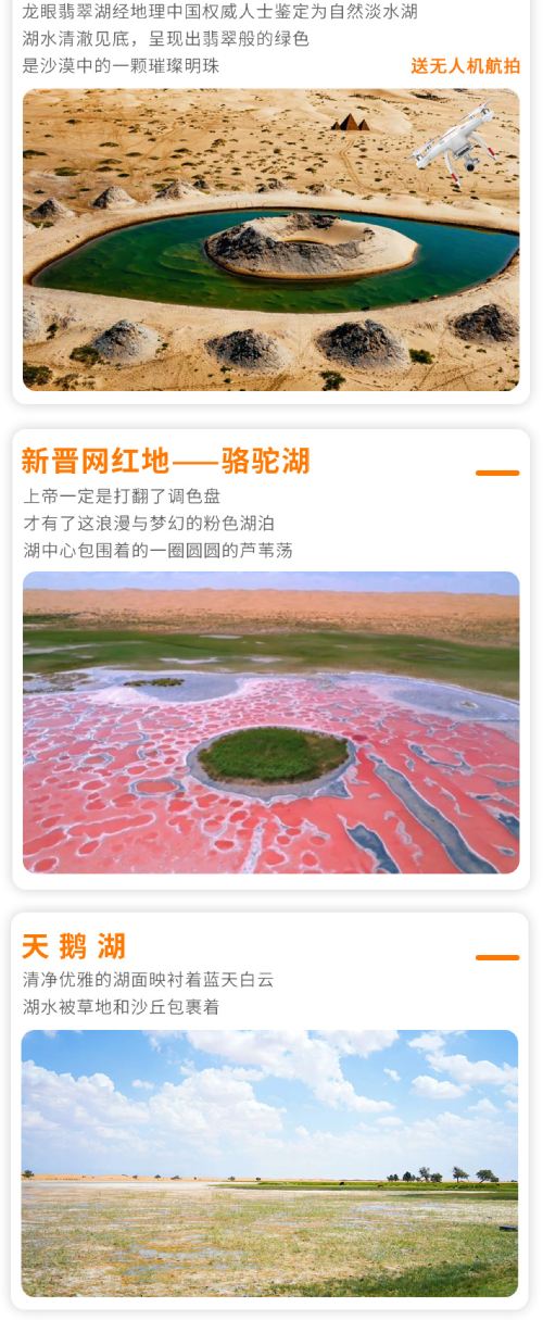 【五湖穿越专线】腾格里沙漠+乌兰湖+龙眼翡翠湖一日游/赠航拍【[精选路线六湖穿越]乌兰湖、天鹅湖、骆驼湖、海溜淇湖、吉他湖、龙眼翡翠湖(六湖穿越)】