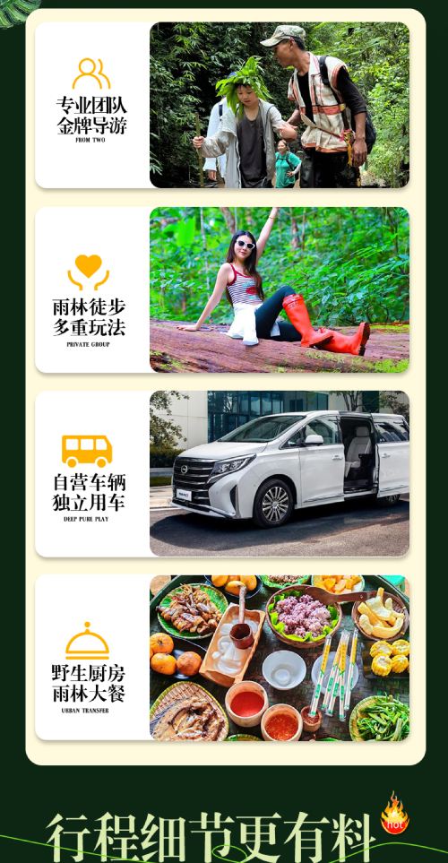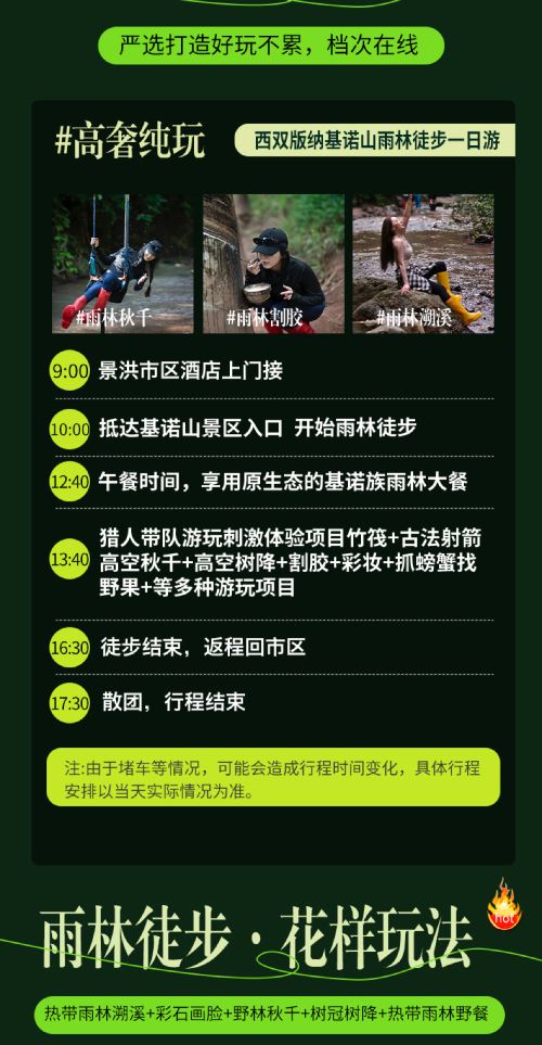 基诺山雨林徒步体验项目标准化服务,没有单项目收费,因此因天气,季节,项目维修等因素,有些项目没法参加不做单项退费,请知晓