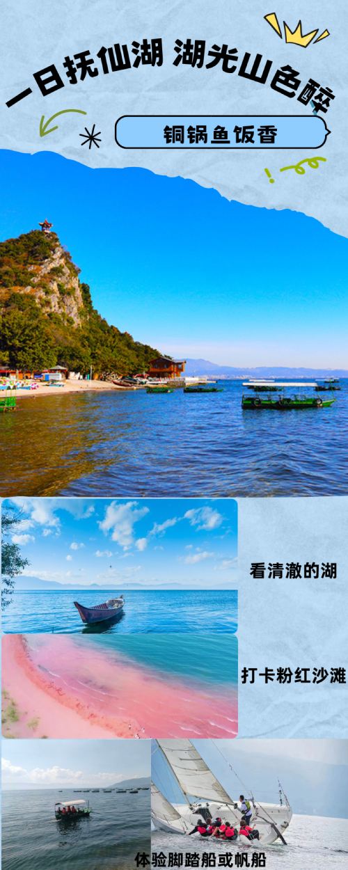 抚仙湖游船+禄充+红沙滩+抚海湾一日游:可升级帆船+特色午餐【[网红景点]特别赠送脚踏船+可选帆船套餐+抚海湾观花海+红沙滩,体验一次难忘的抚仙湖游船之旅】