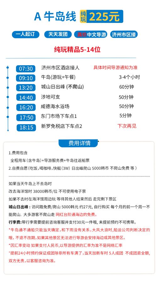 【纯玩牛岛+城山日出峰+涉地可支+咸德/月汀里 】济州岛旅游【1.公司优势:济州旅行社 济州市区内酒店1位起酒店接 一人起订 天天发团】