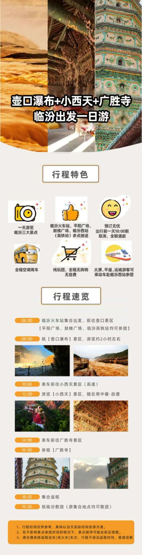 此行程仅供参考,具体时间以当天通知为准,参观景区前后顺序会根据实际情况做出调整。(8月4日起暂时更改为先去广胜寺--小西天--壶口)