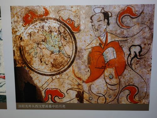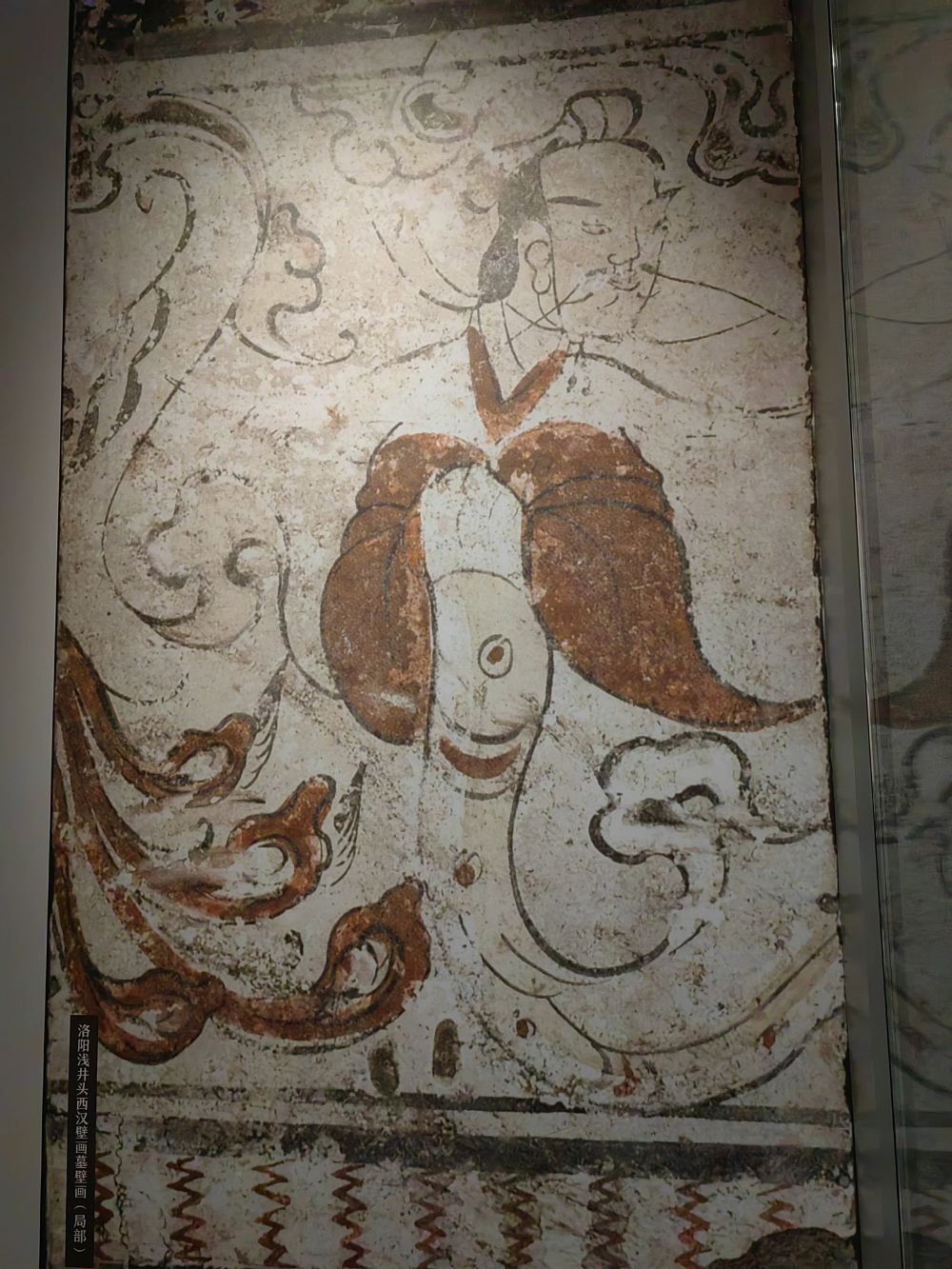 ▲ 洛阳古墓博物馆的卜千秋墓升仙图壁画,是西汉丧葬艺术的杰作。画面绘于墓顶平脊,全长 4.51 米,展现墓主夫妇乘龙凤、在持节方士与仙禽神兽护卫下升仙的场景。伏羲、女娲、九尾狐、玉兔、金乌、蟾蜍等神祇仙物次第排布,云气缭绕其间。它以浪漫的想象构建出汉代人的天国图景,线条流畅奔放,色彩虽经千年仍依稀可见。这幅壁画不仅是中国现存最早的升仙主题绘画实物,更直观呈现了汉代 “引魂升天” 的丧葬信仰,是解读西汉精神世界与艺术风格的范例,为研究汉代绘画、宗教提供了不可替代的实证。