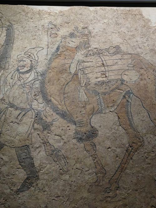▲ “胡人牵驼驮丝卷” 壁画,堪称唐代丝路繁华的 “活化石”。这幅 2 米多高的壁画,绘于唐代安国相王孺人唐氏墓中,胡商深目高鼻、头戴毡帽,牵着体格健硕的骆驼,驼峰上丝卷捆扎整齐。它是洛阳作为丝绸之路东端起点的关键物证,填补了唐代丝路壁画题材的空白 —— 此前胡人牵驼多现于陶俑,以墓室壁画呈现仅此一例。壁画经数年实验室清理才得见真容,其生动细节让驼铃叮当、商旅络绎的丝路盛景跃然壁上,成为中外文化交流的不朽见证。
