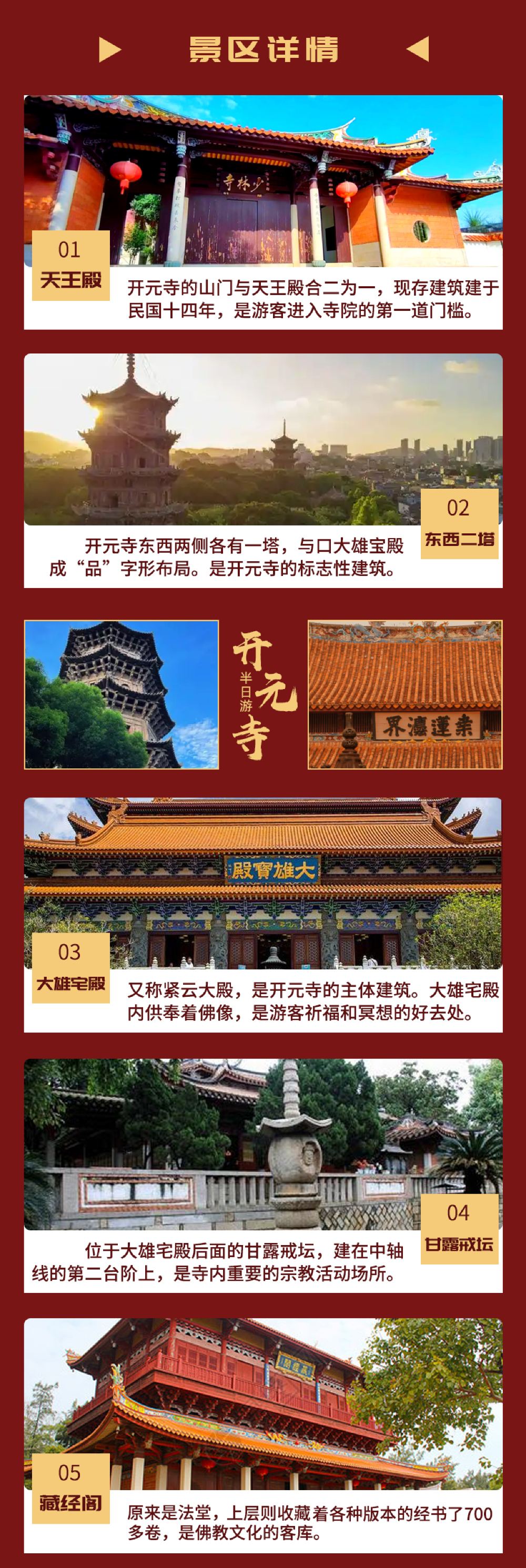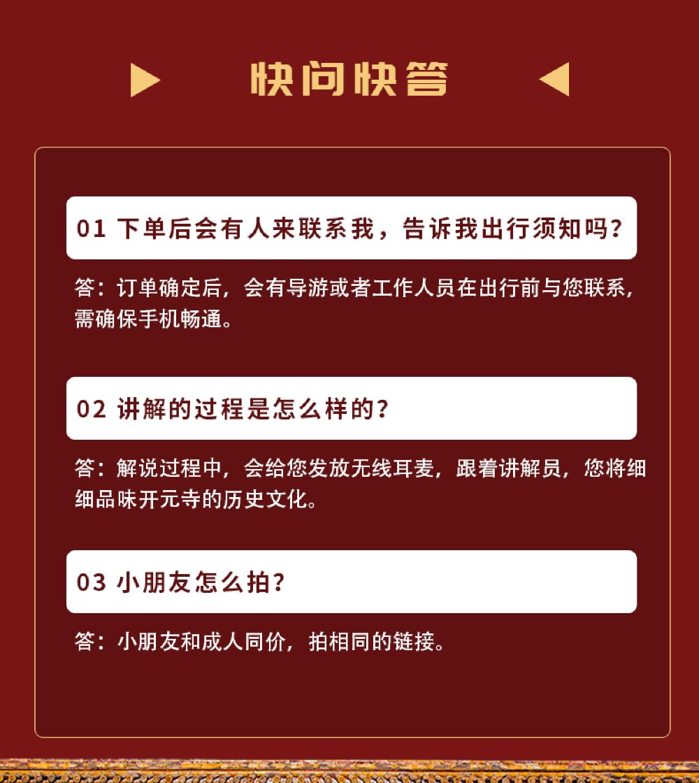 本产品包含泉州开元寺讲解1.5小时,上午场为8:45集合,下午场为14:15集合,上午场为25人以内讲解团体,下午场升级为10人以内精讲小团