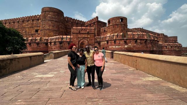 享受快速入园**,参观宏伟的联合国教科文组织世界遗产——阿格拉堡,这里曾是莫卧儿帝国的都城。探索皇家宫殿与庭院,欣赏其壮丽的建筑风格,并在导游讲述莫卧儿王朝历史与皇室生活的迷人故事时,饱览泰姬陵的**景色。