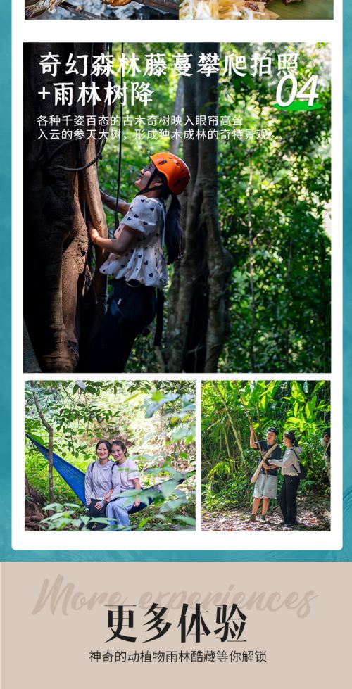 建议穿轻便户外装,短袖,防晒衣,速干裤、防滑的鞋子如若没有,【雨林入口也有售卖雨鞋】