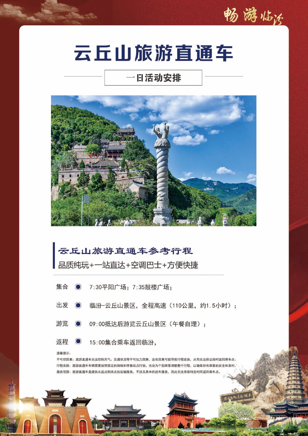 早在临汾指定地点集合出发,车程约1.5小时抵达至云丘山中和文化广场,参观依山而建的层梯状建筑——五龙宫参加祈福活动(供奉真武大帝,实观真武化身龟蛇结合体)。换乘景区交通至“大自然宝库”神仙峪,相传,真武大帝的前身“鲧”在此地修炼成仙;品一口神泉,甘甜可口;参观塔尔坡古村:观民俗表演、打花鼓、看皮影;赏传统手工艺,走进古民居,石墙、石窑、石洞,穿越千年历史,领略古人建筑理念,欣赏建筑活化石,感受山村民歌塔尔坡,观塔尔坡古民居。之后探秘世界三大奇观——【云丘山冰洞群】,领略自然界的神奇景象。之后换乘景区交通车至后山圣母谷停车场,参观葫芦潭、圣母崖;圣母崖,传说有一日,西王母下山了解民间疾苦,来到圣母崖看到此处悬泉飞瀑,绝壁生怪柏。于此逗留,起身时在崖壁上留下一个阴洞,四季流水不断,当地百姓称为“圣母崖”,也称其为“窟窿崖”。参观结束后乘车返回临汾,结束愉快的旅行!