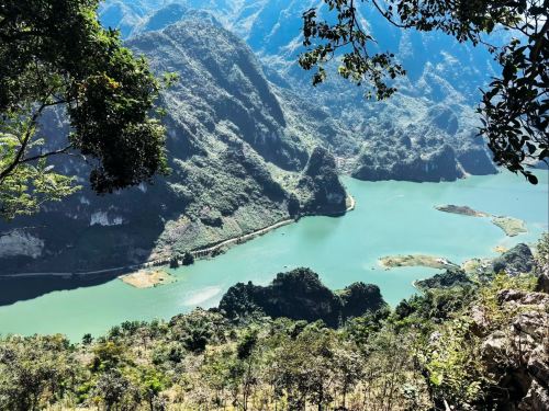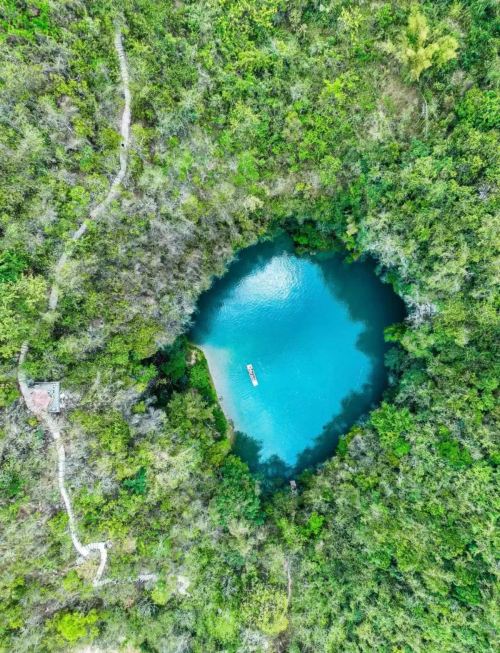 ▲ 三门海以独特的喀斯特地貌闻名, 景观包括天窗群、天坑群和溶洞群,湖水清澈见底,在阳光照射下呈现梦幻的果冻色或蓝绿色,乘船游览时穿梭于洞穴之间,光影交错宛如仙境;主要景点有溶洞口、天窗观景台和社更穿洞,其中社更穿洞是一个天然穿洞,可驾车穿越,岩壁上还有旧时兵工厂遗址。