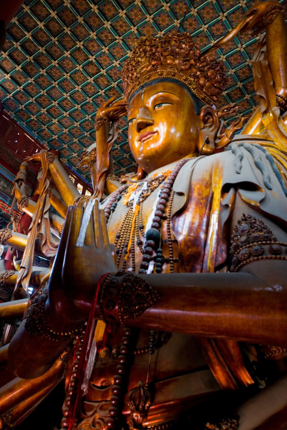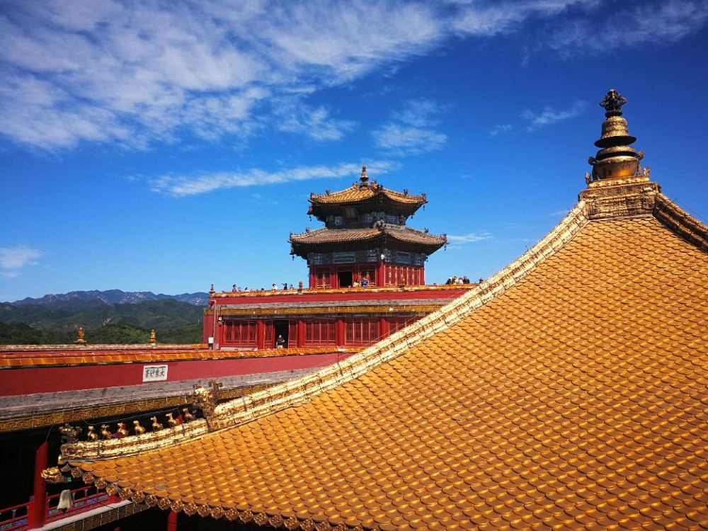 ▲ 寺院主要建筑都在中轴线上,附属建筑则对称地分列两边。主体建筑大雄宝殿为双层歇山式,称为"九脊十龙"殿,内供三世佛与十八罗汉像,壁画环绕。前后两座主体建筑均建在1.4米高的石砌须弥台基之上,殿前的月台有雕刻精美的石栏杆环绕,台阶中央辅有石雕艺术精品"云龙石陛",四角有叫"螭"的龙头。寺庙中有"金龙和玺"与"六字真言和玺"彩画。