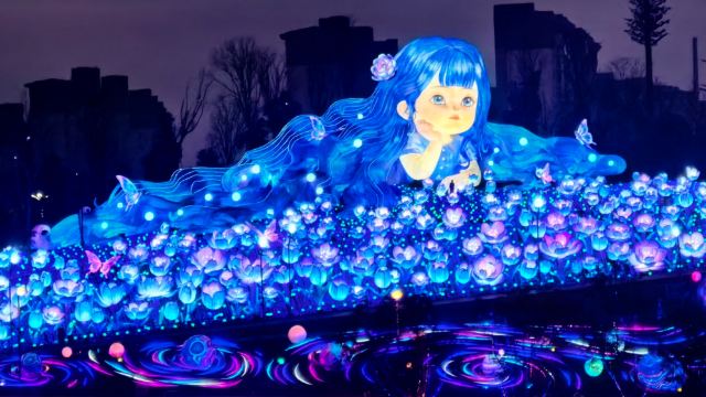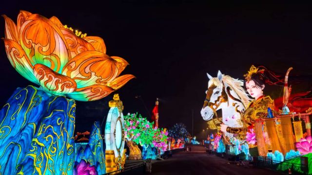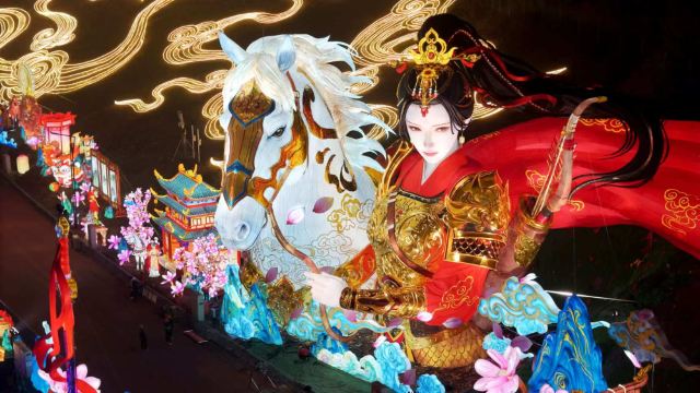 ▲ “木兰传奇”——以《木兰从军》为蓝本打造的180米长“木兰传奇”灯组,让姿态各异的骏马造型与木兰的飒爽英姿相得益彰,传递出深沉的家国情怀