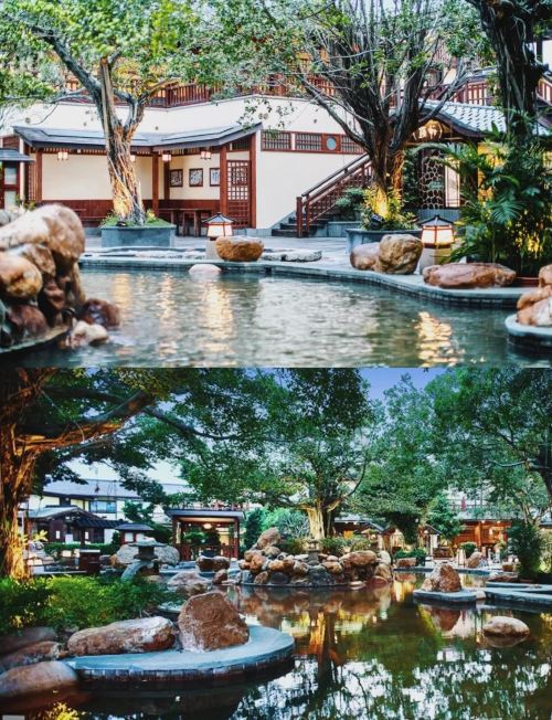 ▲ 度假区设有华兴池、酒温泉、花草温泉等30余种主题汤池,配套桑拿、地热带理疗等设施,并首创"入格"住宿方式及独立院落温泉房型。
