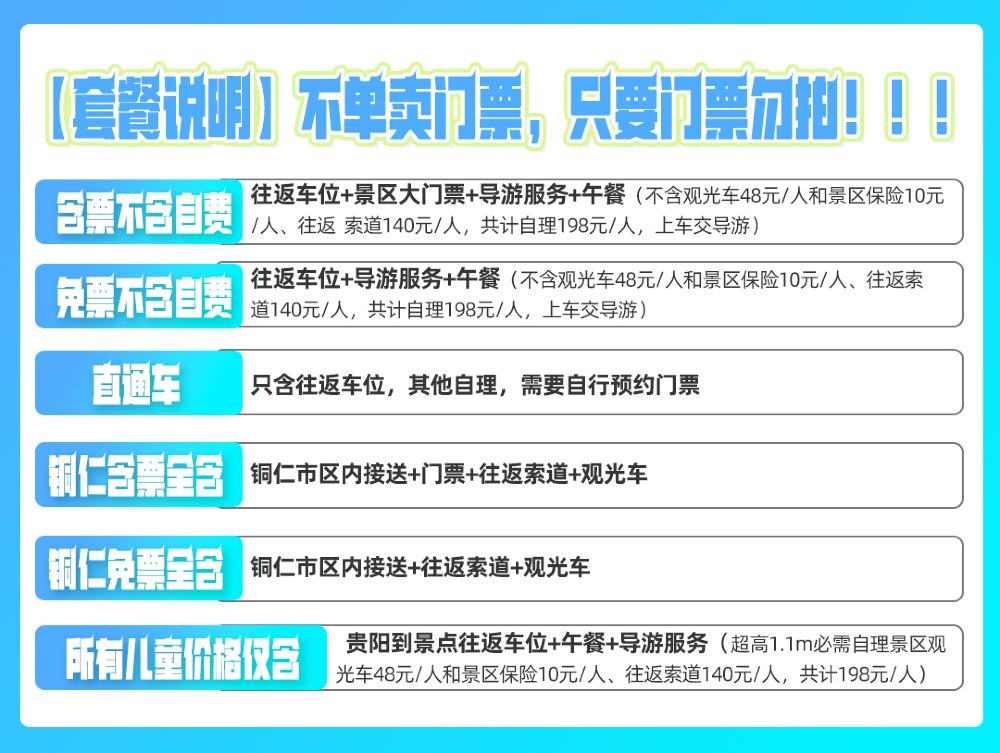 ▲ 铜仁/贵阳出发均不保证入园时段,以实际出票时段为准,如介意时段请谨慎下单! 铜仁门票紧张,不一定有票!请提前咨询客服门票余量再下单!至少提前三天预约,如无门票提前全额退款。门票均为团队票,一单预约成功不能退票! (铜仁出发:不含午餐;12人以下无导游;铜仁市区内可早接;具体早接范围详询客服) 具体车型根据当天实际出团人数安排,敬请知悉。 旺季返程时间不定,不建议购买当日返程大交通哦~
