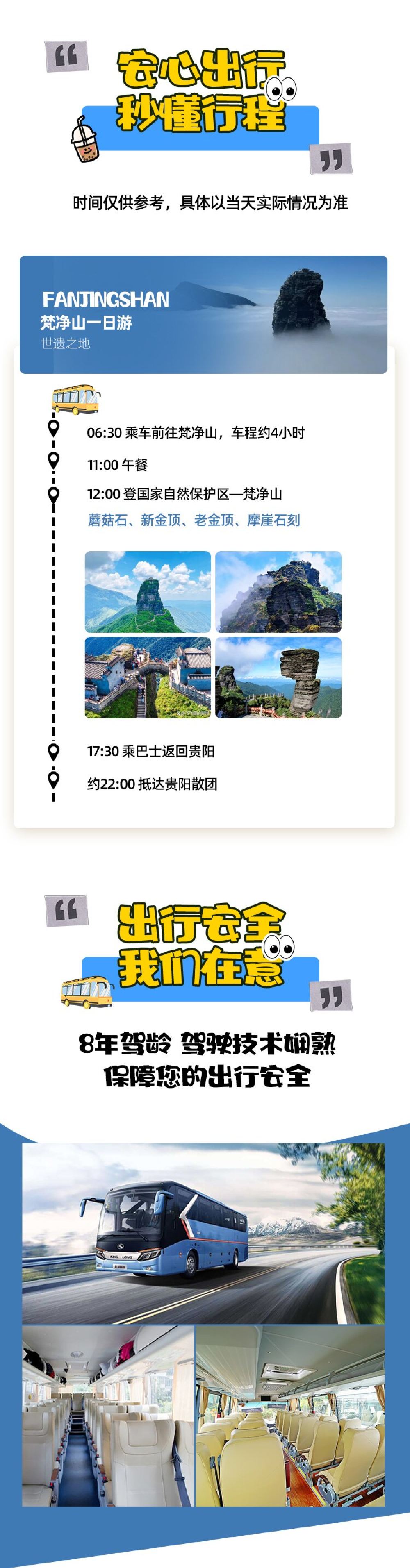 ▲ 由于贵州景区普遍较大,各家庭游览速度不一,为不影响大家的游览体验,导游会在车上进行统一讲解,到景区后自由活动,根据导游通知按时集合返回。页面时间仅供参考,具体出行时间安排以导游通知为准(导游在景区内不带队讲解,敬请知悉)