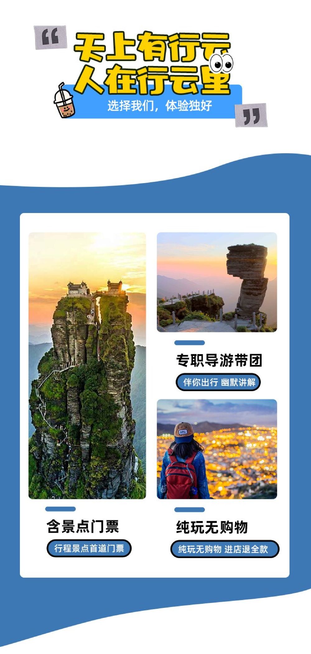 ▲ (贵阳出发)有免票证件请务必提前告知,如已按全票出票,导游现退优惠30元/人,如拍免票套餐无门票优惠可退,敬请知悉 【出团须知】景区执行实名制购票,请在下单时填写清楚个人信息,参团时携带身份证等有效证件。 景区常有大风或者冰冻等情况,景区一般在当天早上九点后发布具体的天气情况,旅行社无法提前预知。如有类似极端天气或大风天气等情况,而旅游大巴已经出发在前往景区的途中,则需要用餐后到景区看景区的实际通知及现场情况。如因天气等原因无法进入,仅能退还未产生的费用,已产生的费用无法退款,敬请知悉