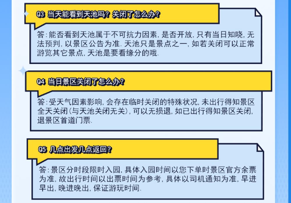 出行前得知景区关闭(不是天池关闭哦)不用车不产生门票可以无条件免费退款,出发后得知景区关闭可以免费退景区门票