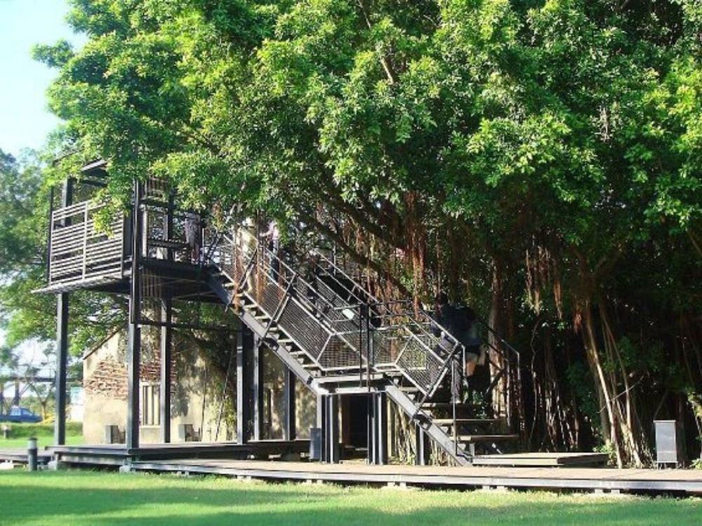 ▲ 【安平树屋】 树屋位于德记洋行后面,原是德记洋行的仓库,大约建于十九世纪末及日治初期,此处曾做为「大日本盐业株式会社」出张所仓库,现况规模即为日本人增建。 经百余年岁月沧桑后,仓库墙面满布榕树盘据的气根,高耸的榕树茂密的树冠仿佛成为仓库的屋顶,也让安平树屋拥有难得一见的外观及神秘气息,形成特有的屋树共生奇景,类似吴哥窟大树盘缠着「塔普伦寺」。现今内有规划完善的木栈道让人穿梭于树屋之间,也可往上穿梭在树冠之中,常可见许多的松鼠与鸟类在树冠间嬉戏,生态良好。走累了就近到树屋园区内的树屋咖啡休息,来支