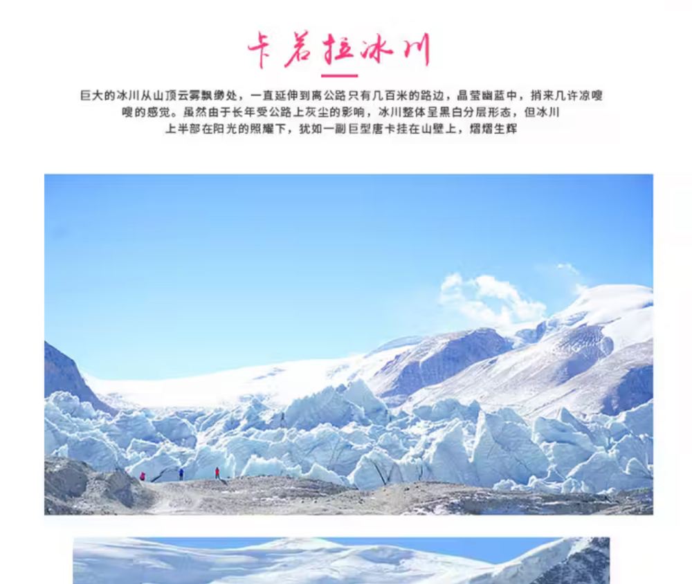 2.洋湖+卡若拉冰川套餐价不含两个景区的门票费用,若产生门票游客自理;