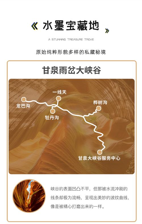 雨岔景区近期游览路线:游客中心——龙巴沟峡谷——月牙谷峡谷——游客中心