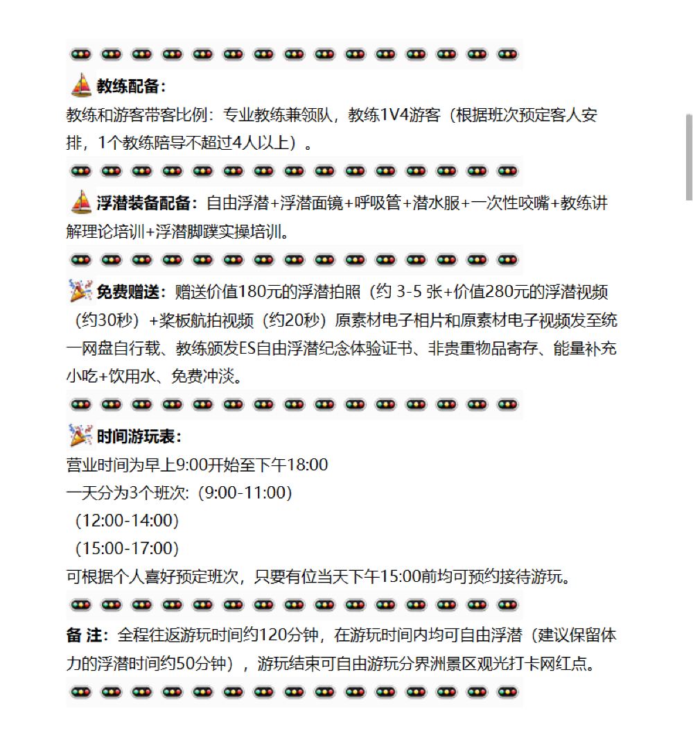 11、浮潜期间教练1V4人以内全程跟陪指导浮潜游玩。