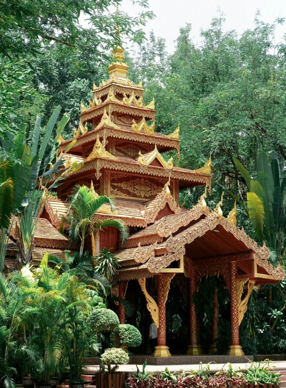 ▲ 走进园内,气势恢宏的傣式建筑、金碧辉煌的佛塔庙宇,将傣王室文化、民俗文化与佛教文化融合得恰到好处。这里还是个迷你植物园,黑心树林里藤攀葛绕、鸟语花香,超治愈~