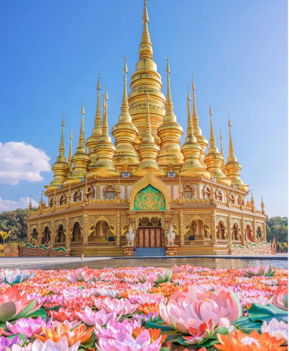 ▲ 踏入这里,就像走进了一个神秘又神圣的异世界。夕阳西下,余晖洒在金光闪耀的佛像和佛塔上,那画面美得摄人心魄,随手一拍都是壁纸级别, 天空像是被打翻的调色盘,绚烂的色彩与庄严的佛寺相互映衬,让人忍不住屏住呼吸,生怕惊扰了这份宁静与美好。
