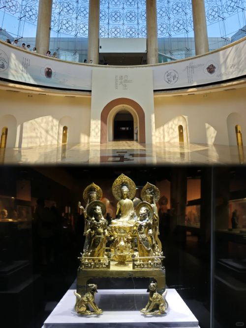 ▲ 展馆整体外观以天圆地方理念创作,院藏品有11万件/套,大部分文物出土于周、秦、汉、唐等中国历史上有重要影响的朝代 楼:博物馆进入后正对面是临时展览,地上是长安城变迁图,左侧佛像专题展 楼:天地之灵——院藏古都玉器精品陈列